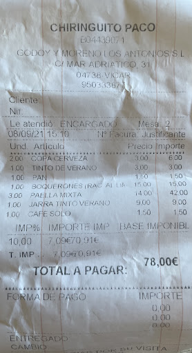 The worst chiringuito i have ever been to. The manager was inhospitable and very rude. I grew up in Almería and sat down to get a tapas. He pretended not to hear me when I asked for the tapas. After waiting for 30 minutes I asked another server who brought it to me in 5 minutes. The manager was furious and started to shout at him. I was wondering if o had done something wrong. I obviously had more yet being tall and blond he was trying to take advantage of me and was angry that the other costumer had treated me like a local instead of a tourist. I them asked for half a porción of chipirones as i was hungry and he ws refusing to give any tapas with other drinks. By this I mena completely ignoring me whilst drinking chupitos with at least ten locals that had entered. I heard him giving it to them for free. He then brought me a drink I had not asked when I grew up speaking Spanish and was speaking very clearly. I realized it was just so he could rip me off more. He then told the server that was nice to me that I was never going to be coming back to the place as he was going to make me pay 35 euros for it. I was shocked to hear him say it and the other server was feeling uneasy about him. He brought the chipirones which was a small porción. When I stood up he charged me 35 euros for two drinks a small porción of chipirones. The chipirones were cooked in cheap oil so would not recommend it. He then stryed laughing at em when I was paying. I did not know him and was kind to him yet he mistreated me. If you are a foreigner stay far away from this restaurant there are many...