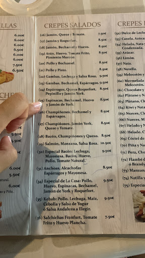 Las crepes de sal, 😢 terrible. Una que pedí de alcachofas, espárragos y otras cosas, más mayonesa que cualquier otro ingrediente, como; champiñones, los pimientos, espárragos, eran de lata! 😱😱 en Almería 😱😱 Las salsas, muy malas!