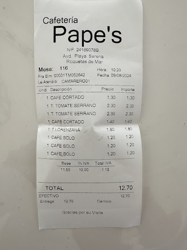 Increíble lo que me ha sucedido. Llevo yendo al Pape's desde hace más de 8 años. A mi hijo pequeño le encanta porque echa una partida al billar mientras nosotros tomamos una copa. Hoy hemos hecho lo mismo. Y cuando estábamos disfrutando de la copa, veo que mi hijo mayor tiene el codo con una mancha rojiza. Al principio pensé que era sangre, pero no, era pintura. Tenía ya todo el pantalón manchado, y me miro a mí y también tenía el pantalón y el polo manchados de rojo. Cuando se lo he dicho al camarero, me dice que ya llevan varios clientes que les ha pasado lo mismo. ¡Increíble!. Que han pintado las sillas y la pintura no ha secado bien. No me lo puedo creer. Me han ofrecido amoniaco para limpiarnos, pero lo de la ropa no ha salido. He pedido la cuenta, pensando que asumirían su responsabilidad y no nos cobrarían (la cuenta era de 25€, que no cubre ni de lejos el coste de dos pantalones y un polo para tirar). Pero nos han traído la cuenta y no han dicho ni mú. El camarero nos ha pedido disculpas. Entiendo que él no tiene capacidad para decidir nada. Pero estaba el dueño y no ha dicho nada. Y nos ha visto perfectamente. He pagado y no vuelvo nunca más. ...