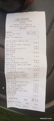 Read moreSi buscas un restaurante para comer bien y darte un homenaje con tu pareja, familia o amigos, lo has encontrado: restaurante ALINEA en Roquetas de Mar, con ambiente muy agradable y acogedor. El servicio de sala muy atento y profesional tanto Alberto como Pascual, asegurándose constantemente de que todo esté perfecto, muy bien servido y sin ser agobiante, de diez. En cuanto a la cocina, la chef Estefanía y Fran su segundo, consiguen con sus platos exquisitamente presentados superar todas las expectativas. El producto de la tierra y de primera calidad, combinando perfectamente los sabores tradicionales con otros asiáticos y de la cocina moderna más actual. Las alcachofas a la brasa, los gurullos de Almería, las mollejas de ternera, las entrañas, la presa ibérica, etc, etc, te vienen a la memoria los guisos de tú madre pero con un sabor especial y muy personal de la chef Estefanía. ESPECTACULAR. No menos interesante nos parecieron los puerros a la brasa, el contramormo de atún, el huevo de oro con txangurro, las entrañas de Angus etc, etc. todo delicioso y elegante.. Se nota el mimo, la pasión y la sabiduría que ponen en los platos, mezclando magistralmente los sabores tradicionales con los orientales y un toque moderno. Y en cuanto al momento dulce: "Quieres un beso", el "Mango tai" perfectos y por último "La torrija", de verdad , hacia mucho tiempo que no degustaba un postre parecido. "ESPECTACULAR" La bodega muy correcta y variada. Y para concluir, no me extraña que recientemente haya conseguido ser "Recomendado por la Guía Repsol", aunque creo que la cosa no se debe de quedar ahí. Este grupo de profesionales dirigidos por Estefanía vuelan alto y no me extrañaría que pronto les lleguen más altos reconocimientos. Un lujo y un placer chicos. Nosotros os vamos a...