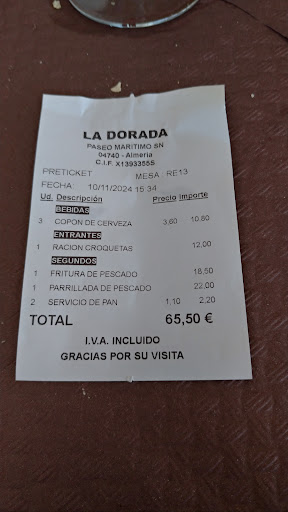 Read moreHallo, ich war auf dem Rückweg nach Deutschland noch mal im La Dorada sehr sehr lecker essen. Vorab Gruß aus der Küche und dann sehr lecker Wolfsbarsch-Filets mit Scampi. Das Essen ist hier sehr gut. Ich komme wieder. Hallo, auch im November 2024 mache ich auf dem Weg nach Gibraltar eine Woche Pause in Roquetas de Mar. Auch dieses Jahr habe ich zwei mal sehr lecker im Restaurante La Dorada gegessen. Sehr leckere Wolfsbarsch Filets mit sehr leckeren Beilagen und beim zweiten Besuch eine perfekte Seezunge. Beim zweiten Besuch gabe eine Fisch-Krokette mit Aioli als Gruß aus der Küche. Ich wurde vom gleichen freundlichen Mitarbeiter wievin den letzten Jahren bedient. Ich komme sehr gerne wieder, Beste Grüße Frank Koop Moin, dieses Restaurant liegt direkt an der schönen Promenade von Roquetas de Mar. Bin hier Sonntag bei einer Fahrradtour vorbei gekommen und alle Tische vom Restaurant draußen waren besetzt. (Ende November). Ich finde das war ein gutes Zeichen und bin hier dann gestern zum Essen gewesen. Eine sehr gute Entscheidung. Ich hatte Nr. 30 Wolfsbarschfilets mit Garnelen und Piemienteos de Padron. Due Garnelen sehr lecker. 5 mega leckerere Wolfsbarsch Filets - sehr lecker gewürzt und auf den Punkt gebraten - noch schön saftig und mit viel Knoblauch. Grüne Paprika war zwar wenig auf dem Teller aber das andere Gemüse war auch sehr lecker. Als Vorspeise gsb es einen „Gruß aus der Küche“ - super leckerer Kartoffelsalat mit Thunfisch, Ei, Paprika und Zwiebeln. Zum Abschluss gab es dann noch einen Bailays auf Eis. Ich bin sehr zufrieden und werde hier bald wieder essen. Beste...