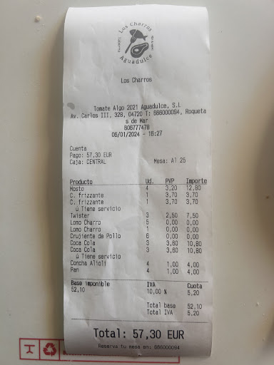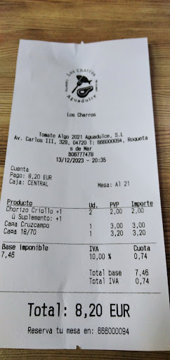 BAR LOS CHARROS EN AGUADULCE PESIMO NEFASTO SURREALISTA. Miércoles 13-12-23 a las 20.10h mi vecino y yo decidimos tapear en el bar Los charros de Aguadulce. Yo vivo en Aguadulce pero llevaba tiempo sin ir. Al llegar, cómo acababan de abrir, sólo había 3 personas, y al menos 30 mesas libres..o mas. Dos chicas en una mesita de dos y otro hombre en otra de dos. Vi que algo había cambiado. Ya no estaban los chicos tan simpáticos que había antes. Al preguntar dónde podíamos sentarnos el camarero, un hombre calvo(sólo es para identificarlo),dijo que sólo podíamos en una mesa de dos. En total sólo quedaban tres libres. Las 3 peor situadas, las otras 25-30 para 4 o más personas VACIAS y sin arreglar. Tuvimos que aceptar sí o sí, y el camarero nos sentó al lado del otro cliente... a un metro, tanto que tuvimos que alejar un poco la mesa. Allí no hay para sentarse en el interior del bar si no es la barra. Lo que antes era el sitio interior de mesas, ahora es un medio trastero lleno de cosas que daba repelús sólo al verlo. Todo lo que es lo de las mesas es exterior, protegido por las típicas lonas transparentes de terraza. Al final, cómo no se podía elegir un sitio más resguardado, nos sentó justo en el medio del paso del aire que, a pesar de las estufas calentadoras, se puso insoportable. Estamos en Almería. El viento viene con la consumicion. Pedimos al camarero si podíamos cambiar de mesa y no contestó de forma muy arrogante que no.. que no. Que no habíamos entendido nada y que no podía ponernos en una mesa más resguardada porque eran todas para mínimo 4 personas. Era por si llegaban más clientes. SURREALISTA. Eran ya las 20.20h de un miércoles, con viento, chispeando, y con sitio libre para al menos 100 personas más. No sé si el tipo esperaba a algún autocar o algún crucero amarrado en el puerto. En un miércoles. Le dije que no era forma de tratar a unos clientes que no se sienten a gusto en un sitio que no habian podido elegir y que visto la hora y la cantidad de sitios libre, no creia que le hubieramos hundido el negicio y que sólo era para tomar un par de cañas y luego marcharse. Fue muy muy borde. Al final accedió a que nos sentaramos a otra mesa más resguardada. Sólo porque yo empecé a quejarme de forma contundente. Delante a todo el mogollón de clientes... 3 personas, y mientras tanto no había entrado ni el tato. Pero la situación PATETICA llega ahora. Pedimos de tapa chorizo criollo que venía con suplemento de 1 euro. Trajeron un chorizo criollo de 5 cm en un panecillo reseco. Pedí a la camarera alioli o algo para que no resultara tan seco y me dijo que el alioli era aparte y que había que pagarlo. Pero mayonesa o ketchup no. DE VERGUENZA!!!! Eso es en nuevo Charro de Aguadulce señores. No sé si el que nos atendió era el dueño o un camarero. Era un hombre calvo. Mucho tiene que aprender. Por cierto. Nos marchamos a las 20.40 y seguían las únicas tres personas. Y las otras 30 mesas vacías. No puse foto de la tapa porque me daba vergüenza ajena. Pero el ticket habla por si sólo. Un robo. PARA NO...