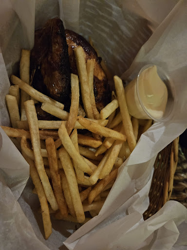 En cuanto a la comida, pedí medio pollo con patatas fritas. Las patatas, crujientes pero demasiado saladas, estaban correctas para el precio. El pollo, en cambio, fue un verdadero punto fuerte: porción muy generosa, carne tierna y sabrosa, digno de una excelente relación calidad-precio.