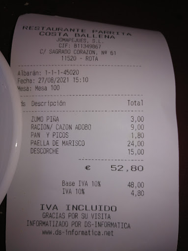 Read moreLlegamos a costa ballena y dimos con este restaurante. Trato atento. Imperdonable que no tengan carta con el precio de lo que ofrecen. Al final pides a ciegas y te cobran lo que les parece bien. Una ensalada de la "casa " a precio de oro y lo unico que tenia de extraordinario era una salsa de mango. Pedimos dos bistec para los niños y nos trajeron dos entrecot a 18 € cada uno y ademas de mal genero. Nos colaron en la cuenta una racion de puntillitas cuando habiamos pedido media racion. En fin que 100 € por 2 adultos y dos niños, la comida nada del otro mundo y lo mas lamentable sin una carta para guiarte en los precios. No volveremos. Nada...