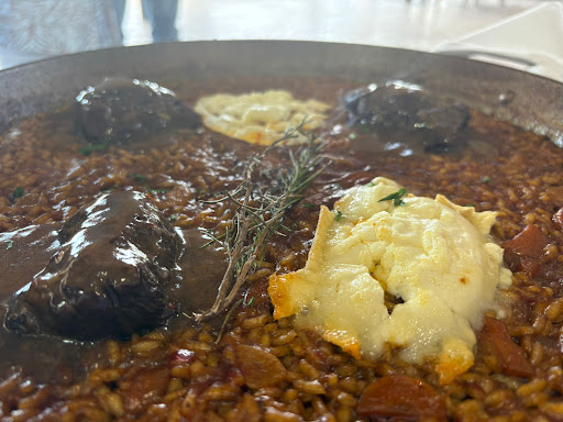 DELICIOSO. Esa sería la palabra para definir nuestra experiencia en RESTAURANTE NAOS. Alojados en el HOTEL PLAYABALLENA en varias ocasiones es la primera vez que comemos en NAOS y no va a ser la última porque hay muchos platos y algunos arroces que nos hemos quedado con muchas ganas de probar. Cuando uno va a un restaurante lo principal que quiere es COMER BIEN y por eso voy a empezar con ello en esta reseña. Pedimos unos entrantes para compartir y a cual más delicioso. Muy muy recomendable uno que estaba fuera de carta que era como un BRIOCHE de PULLED PORK...riquísimo, llevaba una melaza dulce que combinaba increíble...un aciertoñ De los otros entrantes...ZAMBURIÑAS y CARPACCIO DE GAMBA BLANCA muy fresco todo y con mucho gusto en la presentación. Y también unas croquetas de rabo de toro deliciosas. Una vez arrancado con los entrantes pedimos un ARROZ con CARRILLERA y RULO DE CABRA....¡¡¡ ESPECTACULAR !!! Súper diferente a los clásicos arroces...eso sí...te tiene que gustar la carrillera y el rulo de cabra...a nosotros nos encantó. Nos quedamos con muchas ganas de probar el arroz del señoret y el de verduras de la huerrta....QUE TENÍAN UNA PINTA cuando llegaban a las otras mesas... De los postres mejor no hablar...hay 4...pero qué 4 postres...a cual mejor. Sin duda alguna para mi gusto la TARTA DE QUESO con PISTACHO es un 10...como fan de la tarta de queso y el pistacho se te hace la boca agua cuando te la llevas a la boca. Luego estaban unos canutillos de ricota con pistacho muy buenos, quizás algo menos dulce pero también ricos. Un postre de chocolate mezcla duilce y salado espectacular y otro que iba como con piña con helado de coco súper refrescante. Nos gustó mucho ver al CHEF (que según nos comentaron es uno de los mejores ARROCEROS de CÁDIZ) preparar con detalle toda la comida, la presentación, se veía que no es el típico restaurante de playa sin más, sino que tenía un punto más de calidad y gusto. Nos sorprendió el fresquito que corría, eran las 14.30, con bastante calor de AGOSTO y se estaba muy bien. Por último me gustaría hablar del buen servicio que tuvimos, en especial el MAITRE BORJA siempre pendiente de todo con discreción pero muy atento, y el camarero que nos atendió, que ya conocíamos del HOTEL que se llama MARIANO y nos atendió con una profesionalidad que ya no se encuentra en muchos sitios de hostelería. Con la sonrisa siempre, explicando cada plato como si fuera un restaurante de estrella MICHELÍN, diciendo de dónde venía el producto, lo que el chef quería lograr, etc... Como digo una experiencia 100% recomendable...y para familias con niños también había platos para ellos que tenían buena pinta tipo pasta o escalopes que dan buen servicio también para los niños. DESEANDO VOLVER PARA PROBAR OTRO DE ESOS ARROCES...