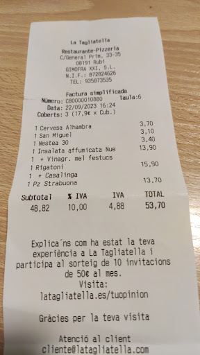 Es más, a la semana siguiente hicimos la prueba, fuimos a otro restaurante Tagliatella y a pesar de que de entrada ya llevaba el doble de cantidad de crema balsámica que en Rubí, preguntamos que cuanto nos costaría el suplemento de poner un poco más y curiosamente nos dijeron que nada, que no había ningún suplemento, lo que confirmó que en Rubí querían cobrarnos algo, al margen de la carta de Tagliatella, en la que no figura suplemento alguno.