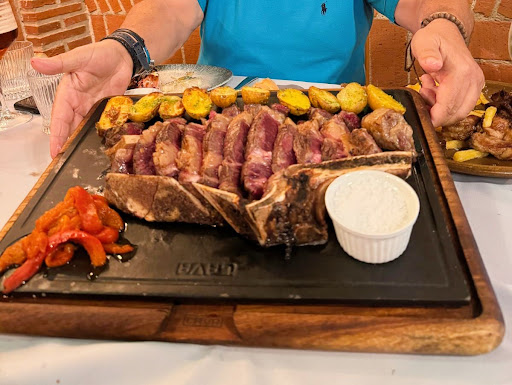 Read moreRestaurante a la entrada de la localidad de rueda. Fácil y rápido acceso desde la A6. Local acogedor, servicio muy atento y rápido. Pedimos croquetas de vieiras, pimientos del padrón (muy baratos y ricos) y un salteado de boletus trufados con huevo riquisimo, insaltable si te gustan las setas, para dejar el plato bien limpio con pan. De principales pedimos canelón de lechazo, bastante grande; bacalao, muy rico; y la estrella un entrecot al punto en la brasa que estaba especial. Unos vinos y un agua para cerrar. Amplia carta de vinos, pero fuimos a lo sencillo, unos ruedas. Además de cafés y una tarta de fresa con helado y petazeta que estaba riquísima. Calidad precio muy bien, rapidez en la atención y en un local muy acogedor. Decir que tiene también ambiente de barra, con pinchos para los que tienen prisa. Tiene parking propio amplio y aledaño a la entrada. Los baños están muy limpios, parecen los de tu casa. Volveré sin ninguna duda, y ya lo estoy recomendando. Parar en bares de carretera puede ser sinónimo de muy buena comida. Pd. Tiene sección tienda de...