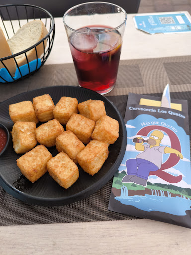 Read moreLlegamos a las 23h. que en verano, la verdad, no me parece tan tarde. No nos atendieron y le dieron la vuelta al cartel de cerrado en otro sitio del pueblo, que era la primera idea. Después vimos otro restaurante ya casi vacío y con la luz de dentro apagada. Y el único sitio con vida por el pueblo era "Los cuatro" en la plaza. Ya había comido alguna vez más, y no me disgustó la opción así que pregunté si había cocina aún antes de sentarme y el camarero muy atentamente me dijo que creía que si, comprobó y vino al momento. La disposición fue maravillosa. Entiendo que lo mismo es un poco tarde, pero no me creo que no puedan otros ofrecer aunque sea un bocata de queso, incluso para llevar. Decidimos pedir una hamburguesa de las más especiales y una ensalada. La ensalada para mi gusto estaba muy rica, con salsa de yogurt suficiente y pollo también en abundancia. Y la hamburguesa es deliciosa, con pan tipo mollete y de vacuno 100%. Los camareros fueron muy amables, estuvimos con nuestros perros sin problema y muy, muy a gusto. Detalles monos como unas fundas de servilleta y cubiertos muy coloridas y bonitas. Muchas gracias por su amabilidad y atención. ¡Nos veremos...