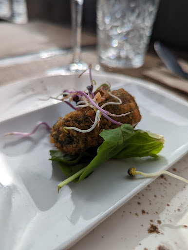 Wir wurden direkt in Empfang genommen und zu einem Platz geführt. Haben uns dann für einen Tee und zwei Cola entschieden. Zu essen gab's Brot mit Aioli und Chicken Wings auf Salatherzen mit Kräutern, Remoulade und Erdnüssen. Die Chicken Wings waren mega lecker, der Aioli Dip war ok, was gar nicht ging, war das Brot. Selbst ein billiges Aufbackbaguette wäre leckerer gewesen als dieses Brot, das geschmeckt hat, als wäre es von vorgestern.