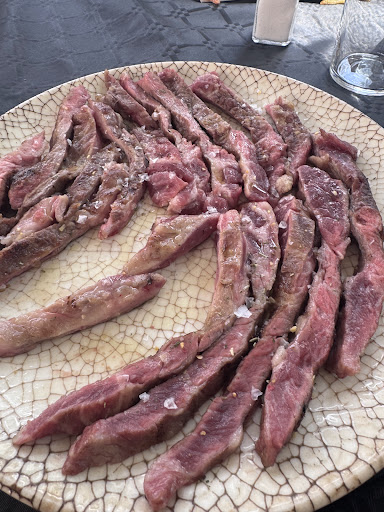 Esta vez si nos dicen que tienen carne curada y pedimos un entrecot, para compartir, y de segundos una dorada y un llobaro (en otra ocasión ya tomamos allí pescado, y estaba buenísimo.