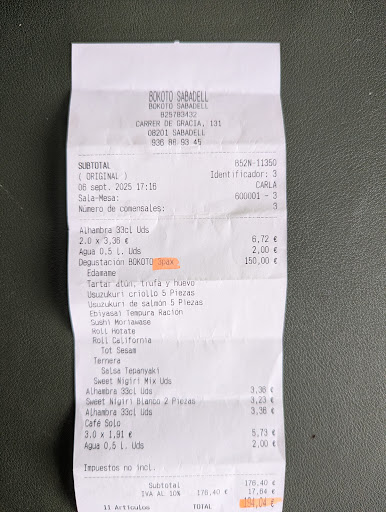 Read moreVoy a empezar siendo muy claro: de lo peor donde hemos ido ido en mucho tiempo. Hemos ido a cenar con muchas ganas, ya que hemos visto buenas reseñas y hemos tenido alguna recomendación... pero han sido todo decepciones. Para empezar, aunque esto es algo personal, nos han puesto en un salón solos, arrinconados, que decíamos "no sabemos si esto es romántico o un rincón para castigados". El tema de la comida, pésima en casi su totalidad. El corte del pescado era irregular, el de ventresca de atún ha sido incomestible (lo hemos dejado en el plato) y los huevos de codorniz sin yema (rota imagino). Pero lo que me ha hecho cabrear, es con en el Roll Bokoto, donde se veía claramente que el jamón era de paquete y corte industrial, como el paquete del supermercado (además dudo que fuese jamón y no paleta, pero con el corte no lo puedo asegurar) y los picatostes, claramente industriales, de bolsa y que llevaba varios días abiertos por lo secos que estaban. Lo único que nos ha gustado son las nubes crujientes de salmón. La atención de personal nos ha dejado mucho que desear, muy fría. sin saber que recomendar ante la falta de un plato y con la respuesta de "oh, vaya" cuando nos ha preguntado que tal todo y nuestra respuesta ha sido "no muy contentos, la verdad...". Ah! Y que no se me olvide, no lo hemos comentado en el restaurante, porque ya era un: y venga, ahora que mas... 2 de los 5 platos servidos tenían algún pelo... Sabemos que la gente pone una estrella por cualquier cosa mala, pero es que hoy, solo se puede "salvar" un plato de toda la experiencia en este restaurante y no creo que se...