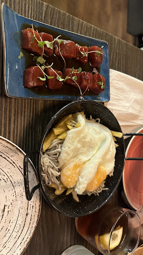 Read moreLa comida está muy buena. La primera vez pedimos dados de atún macerados, riquísimos, los huevos con patatas y gulas, carpaccio de wagyu y los bollos de carne con mayonesa kimchi (muy buenos y tiernos pero al tardar en hacerse y ser el último plato no pudimos acabárnoslo). La segunda vez repetimos con los dados y pedimos las gambas al ajillo (un poco escasas y demasiado aceitosas para nuestro gusto), las rabas de pollo rebozadas con all i oli con miel (bastante sin más, poquita salsa a mi gusto) y meloso de ternera (un poquitín salado). El pan con tomate esta muy bueno y el servicio bastante rápido. Seguramente volvamos para probar algunos platos más. Lo único malo es que sí es un poco caro para la cantidad de comida que te viene, siendo alrededor de 20-30€...