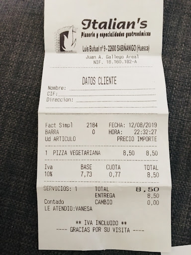 La comida estaba buena, pero la camarera que nos tocó no fue la mejor. Parecía que desconocía la obligación de los restaurantes de dar vasos de agua del grifo a quien lo pida y sin límite. Con mala cara, nos dio uno por cabeza (2 copitas en total) y al pedirle otro para mi hija de 4 años nos dijo que ya no nos daba más y que teníamos que comprar agua embotellada. Además, el mueble que estaba en el comedor de dentro estaba lleno de polvo, y las copas apoyaban la parte por la que bebes en esos estantes. El local no me pareció demasiado limpio. No lo recomendaría para ir con niños, la verdad. Hay otras pizzerías mejores en Sabiñánigo.