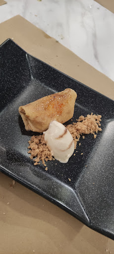 Para el postre, filloas caramelizadas rellenas de crema de vainilla y helado de tiramisú (conjunto muy rico y buen cierre del menú).