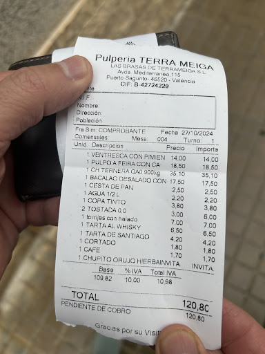 Read morePatético, humillante y la peor experiencia de nuestras vidas en un restaurante (Si se le puede llamar así a ese lugar que de gallego no tiene nada). Mi mujer y yo llegamos allí de casualidad tras un agotador dia de mudanza. Nos adentramos en el local atendidos por un camarero moreno con gafas y bastante irónico y maleducado al que le preguntamos sobre la carta, a lo que nos responde que no nos encontramos en un Burguer King. Nos miramos mi mujer y yo sorprendidisimos, ¿Que le hacia pensar aquello? ¿Nuestra ropa sencilla o aspecto cansado tras un dia de duro trabajo? El caso es que tras devolver la furgoneta, habiamos aparcado nuestro... BMW descapotable enfrente con ganas de cenar en un sitio bien pero vaya, esta vez no habiamos acertado, ni ellos tampoco juzgandonos. Tras revisar con recelo la carta, las mesas servidas de alrededor, y los precios desorbitados para la poca calidad que se veia en los platos, decidimos tomar un refresco y una cerveza (ya que nos habiamos sentado) pedir la cuenta y marchar a otro sitio de la zona. (Playa Puerto de Sagunto) Ya servidos, a los dos minutos viene un señor con aspecto prepotente (debia ser el jefe) a decirnos que nos teniamos que levantar porque las mesas eran de uso exclusivo para cenar invitandonos a que salieramos a la terraza con el frio que hacia esa noche. Mi mujer le explica que nos lo podía haber dicho antes de pedir y que no nos pensabamos levantar hasta que no acabaramos la consumición. El tio entra en cólera, diciendo mil barbaridades, muy nervioso incluso tocando a mi mujer en el hombro con una confianza que me hizo tomar la decisión de pedir libro de reclamaciones a lo que el se negaba, algo que es obligatorio como sabeis. En resumen abandonado el lugar y la mala experiencia cenamos felizmente en El Cortijo Andaluz a unos metros donde disfrutamos de la gastronomia andaluza. Moraleja: Si deseas que te humillen visita Terra Meiga. Para no volver......