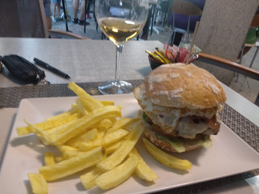Read moreLas opciones para comer son escasas y los 4 nos decidimos por lo que teóricamente era una hamburguesa gourmet, que por 8€ lo podría ser. La carne era de esas compactadas de supermercado y se quedó más de la mitad en el plato. El corte del tomate, pellejudo y en gajos, se salía del pan nada más sujetarlo entre las manos. Las patatas, de las congeladas, estaban mal fritas y parecían de goma. Tuvimos que solicitar a la camarera 2 veces en la mesa que nos diera ketchup y mahonesa y una tercera en la barra. El bote del ketchup, nada de sobres individuales, tenía un pegote reseco el la boquilla de salida. Vamos, que no te aconsejo para nada que pidas hamburguesas. Del resto no te puedo decir nada, aunque en la mesa de al lado había una chica comiendo unas brochetas de pollo, que la pobre hacía esfuerzos para...