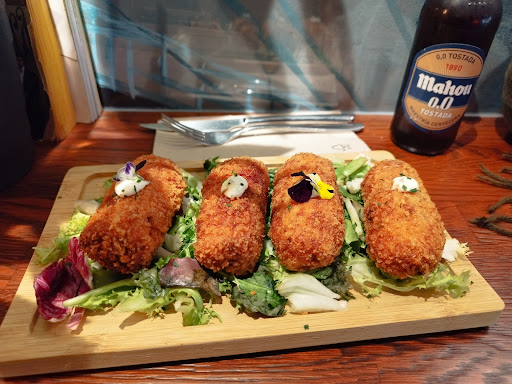 Te las presentan en una bandeja pequeña, una base de lechuga de lechuga y similar, te vienen cuatro croquetas, que son más de tamaño en plan croqueton, muy ricas de sabor, preparadas con bechamel su interior con trozos de jamón, jugosas y se notan que no son de procedencia industrial.