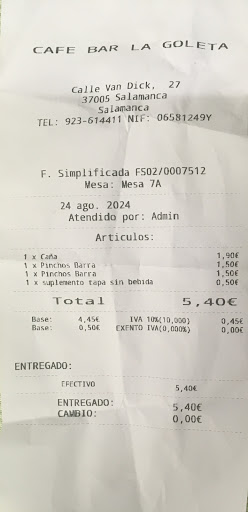Read moreMucho cuidado con lo que te cobran. Si te despistas te “timan” cobrándote ( irregularmente) un suplemento de “0,50€”por pincho sin bebida ( el pincho te lo han cobrado antes a 1,50€ ). La factura es así: 1xCaña…………………………………….1,90 € 1xPinchos Barra……………………….1,50 € 1xPinchos Barra……………………….1,50€ 1x suplemento tapa sin bebida…0,50€