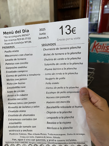 Read moreRestaurante donde poder tomar algo o comer menú (un menú con muchos platos varios). Por la zona puede estar muy complicado aparcar, tienen una terraza no muy grande y un salón interior con bastantes mesas. En mi caso cogí un menú de semana (Lunes - 12€). De precio no está mal, para los precios que hoy día hay,, la calidad de los platos es un poquito baja. De primero pedí macarrones, bastante ricos, con carne picada queso fundido, de segundo bistec, pienso que para llegar a ser bistec le quedaba un paso, las patatas fritas de guarnición bastante ricas y en mi caso la lechuga para guarnición un poco pasada, mi acompañante pidió escalope de pollo y no estaba malo, pero era extremadamente fino, los postres caseros y variados, arroz con leche muy rico y la tarta de queso... Algo curiosa, era como nata montada, pero con queso y un poco de bizcocho en la base. Por lo general está bien si sabes lo que te van a poner y conoces un poco los platos, hay que estar algo pendiente de la camarera, porque en horas puntas la pobre no da para...