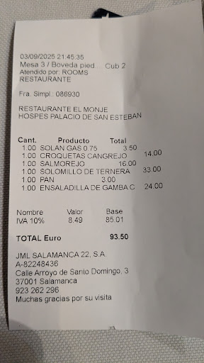 My wife and I made reservations two weeks prior with the highest expectations. The venue is absolutely gorgeous throughout. The interior is to die for. We were seated at the only table in use inside. The restaurant was virtually empty, so don't bother making reservations during a weeknight. The meal started off great with two different compound butters and two tiny pieces of stale bread. The fresh bread arrived soon after. I ordered the crayfish croquettes which were absolutely fantastic. My wife ordered the Salmorejo, also fantastic. The main courses arrived. I ordered a sirloin steak, my wife ordered the duck. My steak was tasty, albeit very small, probably around 100-150 grams. I asked for it to be cooked medium, it was a little underdone, and not evenly cooked. The duck was not edible. My wife could not cut it with the knife provided, and we sent it back. We should have cut our losses, but she ordered the €24 potato salad, yes, you read that correctly, €24 for potato salad, again a mistake. The salad lacked character and was overloaded with mayonnaise. The bill came to a total if over $100 US. There are so many great places to eat in Salamanca. Try your luck elsewhere and eat at a busy restaurant. Aside from the beautiful location Restaurant El Monje was 100% underwhelming and a complete waste of time and money. I'm so thankful that I didn't order wine. I'm sure you can see the interior without dropping 100 bucks, and I am concerned about the honestly of the good reviews that have...