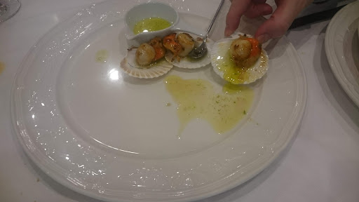 Fuimos a cenar en grupo y pedimos el menú degustación, consistente en aperitivo, cinco platos, postre y café, además de agua y vino. Cuando llegamos teníamos un pan candeal cada uno, y a continuación nos trajeron como aperitivo unas tostas de pan con un paté con pimiento, y todo muy rico. Seguimos con la delicia de bacalao a la crema de almendra, la cual va rellena de una bechamel muy cremosa que recuerda a una croqueta, y está para llorar de buena (imprescindible 100%). El siguiente pase fue un pulpo a la brasa, acompañado de patata con pimentón y una salsa dulzona, y muy rico también. Continuamos con un hojaldre relleno de boletus y foie, el cual se sirve con un par de salsas de fruta, las cuales equilibran el dulzor del plato, y está bien, pero no es algo que repetiría. Como pescado, probamos la merluza O’Pazo, servida con verduras al vapor y una salsa mantequillosa. He de decir que no soy muy de pescado, y me sorprendió lo tierna que estaba, y la salsa estaba muy buena, ideal para las verduras que sin ella resultaban un poco insulsas. En cuanto a la carne, el menú cuenta con solomillo de ternera con salsa de trufa, el cual se sirve acompañado de unas patatas que son lo mejor del plato. La carne no me convenció (el punto no era el que yo habría elegido, y le faltaba sal), y la salsa de trufa correcta. En cambio, las patatas estaban increíbles, si estuviesen como guarnición adicional las recomendaría sin duda, y si vuelvo no dudaré en pedirlas. Finalmente, y ya bastante llenos, probamos el helado de mango con crema de queso, el cual viene coronado con un arándano (bastante agrio tristemente). La crema de queso no es muy intensa, pero está rica, y el dulzor lo aporta el helado y sirope de mango, creando una combinación muy acertada. Salvando un par de detalles, la comida es increíble, por lo cual le doy 5 estrellas y volveré a probar más cosas (y a repetir la delicia...