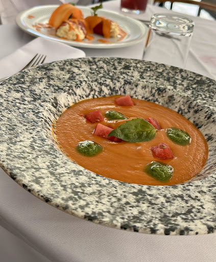 Wandering down calle Librerios, we happened to see a post for a menu del dia at Taberna de Libreros…then we noticed the Michelin ⭐️2024. Needless to say, we sat down. It was just before 1 pm so our server suggested a drink. Best vino tinto I’ve had in Spain. We ordered as follows: sopa de tomate con sandia y pesto And the Piquillos rellenos de ensaladilla. The soup was out of this world good, balanced sweet and sour with the hit of basil and the refreshment of the watermelon. The chillies were beautifully simple and delicious stuffed with the standard Russian salad but very high quality. Next we had: pollo frito del chef con cebolla al habenera - Crunchy, spicy, zingy softened with buttery mashed potatoes. Paced del dia which was Salmon meunière served with a fresh couscous salad. The salmon was perfectly just cooked, moist with a lovely crust on top. We closed with the tarta de queso and the sorbete de pina y coco. It was a cut above the usual and lovely lunch fare...