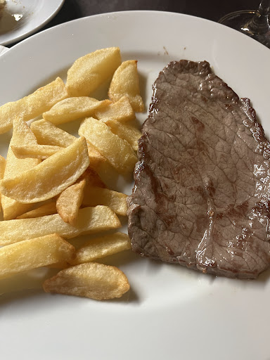 We ordered 2 entrecôtes and when asked which cooking we wanted, we asked « medium-well cooked ». What we got was almost raw and they gave us a small grill plate in case we wanted to cook it more. We used it but it got cold quickly. Then we asked the waitress to take them back to have them cooked again, and she never came. We ended up asking for the doggy bag and we cooked them at home 😱