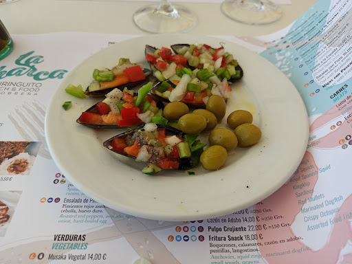 Comida: Respecto a la comida, pedimos una ensalada tropical, almejas, boquerones al limón, salmonetes, puntillitas y un surtido de 3 tartas, aun así creo que está todo pero puede que me falte un plato que no recuerdo. Está todo bueno, pero tampoco es que hubiese nada que me dejase un sabor por encima de lo habitual. Todo ello lo pedimos para un grupo de 6 personas, se puede decir que nos quedamos bien de comida, pero no llenos. La cantidad de los platos la veo normal o tirando a justo, a excepción de los salmonetes que si venían 4 en la ración y estaban bien de tamaño, y la ensalada que era algo más abundante en cantidad.