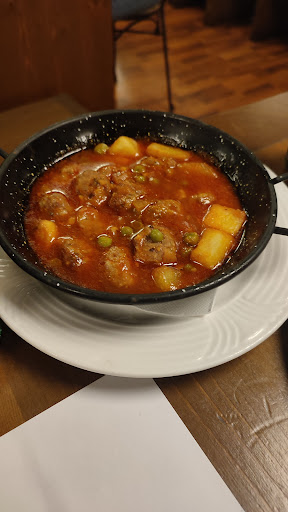 Pedimos para compartir entre 2 personas un humus, pan con tomate, albóndigas a la jardinera, croquetas de cocido, huevos estrellados con jamón ibérico y dos coca colas, y nos costó un...