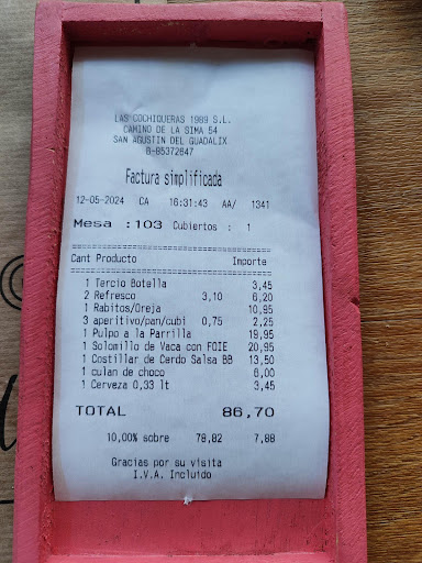 Read moreTenía varias referencias de este lugar, contacté el día de antes para reservar en horario de comida, hay tanta demanda, que tienen dos turnos 13:30h y 15:30h. Escogimos el de las 15:30h, llegamos 10 minutos antes y teníamos la mesa ya preparada. Las instalaciones están en un camino a las afueras del pueblo con parking para vehículos aunque eso sí, con mucho polvo pues es una camino o pista de grava. Tiene un amplia carta y variedad de productos, siendo el cerdo, como no, la especialidad en todas su variantes. También hay variedad de productos del mar, ensaladas y postres. Los precios son razonables y las raciones están acorde al precio. El servicio ágil y atento. Los crujientes de oreja están muy buenos, es un plato muy recomendado, pulpo a la parrilla, bien presentado, al tirante y el puré de calabaza mejorable pero en general el pulpo tiene un sabor intenso. Las costillas están muy buenas, carne tierna y muy jugosa y considero que el precio por la ración que presentamos está muy bien. También pedimos solomillo (se nos olvidó hacer la fotos), con un punto muy conseguido, la carne muy tierna también, aunque no fue el plato que más nos gustó y sin embargo, es el de coste más elevado. Es muy buena opción por la variedad de carta que tiene y sobre todo el hecho de que vaya tanta gente es por algo. Recomendado valoración particular 4/5. - Inconveniente: Siempre hay mucha gente y es frecuente que haya muchas familias con niños pequeños, pero todos hemos tenido niños...