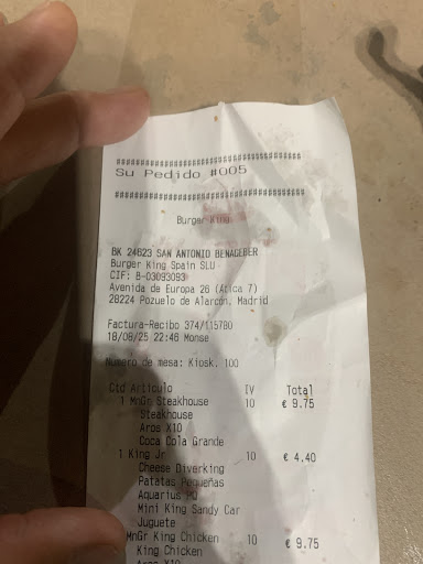 Read moreHe echo un pedido a domicilio y ha tardado, sin exagerar, 2 horas en llegar (de 21:42 a 23:42). Al ver que se retrasaba puse una incidencia, no me contestaron. Al rato llamé por teléfono y me comunicaron que iban a poner otra incidencia porque el pedido salía como entregado desde las 23:07 (mentira), y que se pondrían en contacto conmigo. A eso de las 23:15 me llamaron del BK de San Antonio de Benageber diciendo que el repartidor se había perdido (he pedido varias veces y nunca me había pasado). Al poco tiempo me llama el repartidor en el pueblo de al lado diciéndome que la dirección estaba mal (mentira porque lo he comprobado). 15 minutos después ha llegado como si no hubiera pasado nada (almenos no se habían olvidado de ningún producto, que es lo que suele pasarme). Sinceramente, me he quedado el pedido porque estaba caliente (lo he comprobado), porque sino se lo habría llevado de vuelta. Aunque el cubo de patatas daba pena, la verdad, no llegaba ni a la mitad.