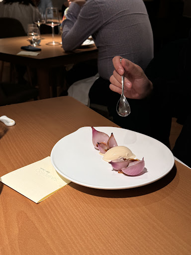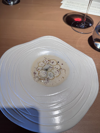 Al llegar, en el exterior, el sitio no aparenta el nivel de gastronomía que contiene dentro. Ya una vez en el salón, con su cocina integrada, nos sorprende y comentamos la cantidad (por los muchos que son) de personal en relación a la capacidad de comensales que será de unas 20 o 25 personas... Una vez comienza el servicio, la calidad (de la atención) es acorde con la propuesta pero sin exageraciones. La vajilla, la cubertería (la cambian completamente en cada paso y con distintos diseños), la cristalería... Todo está acorde y perfecto, sin fallos.