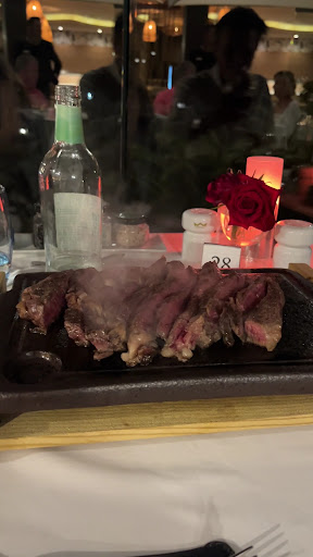 The sirloin steak arrived an hour after we were seated and was served on a hot plate, creating a lot of smoke. It needed more seasoning and time to rest, while the sides—boiled potatoes, limp asparagus, and overcooked peppers—were bland and uninspired.