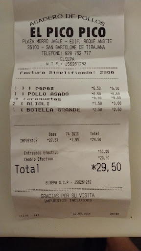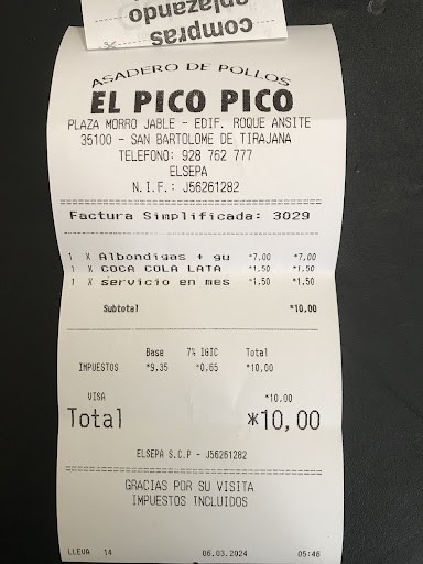 Read moreUna piccola recinzione va fatta su Pico pico...abbiamo ordinato sabato scorso 3 polli una insalata russa insalata di cappuccio e carote e patate...siamo rimasti veramente scontenti ..il pollo non era croccante e nn aveva sapore poco cotto senza nessun condimento patate tagliate senza condimento insalata di cappuccio e carote amara insalata russa inacuata e priva di sapore...abbiamo mangiato lasciando quasi tutto nel piatto ...abbiamo pagato €58 troppo x avere un servizio pessimo e nn siamo rimasti contenti..mai più NN VI LAMENTATE SE POI LA GENTE NN VIENE A MANGIARE DA VOI.CMQ ERAVAMO CANARI È ITALIANI CHE ABBIAMO MANGIATO E NN SIAMO RIMASTI...