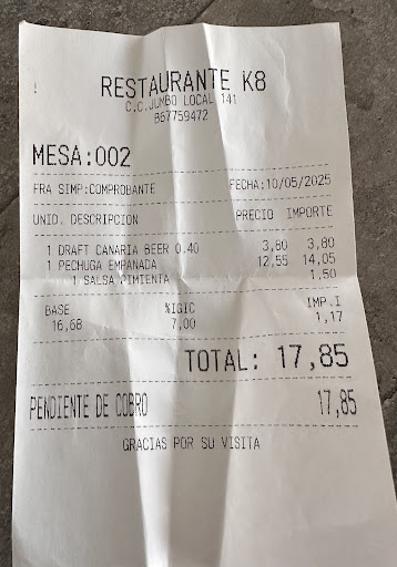 After a disappointing meal at gio restaurante (See my previous review to understand what happened), I was hesitant to try another restaurant nearby. But I’m so glad I gave Restaurante K8 a chance. My first visit (photos 1 & 2) completely changed the mood of my evening. The food was fresh, well-prepared, and flavorful. I had the breaded chicken breast with fries and a Canarian draft beer. Simple, yet delicious. The service was warm and welcoming, and the vibe was relaxed.
