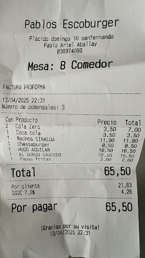 En total gastamos más de 50 € en dos hamburguesas, unas papas y dos refrescos, y sinceramente la relación calidad-precio deja mucho que desear. La sensación final es la de pagar un producto premium y recibir algo...