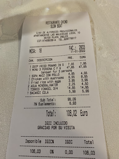 We just left the slow boat restaurant. Food was bland. Not very tasty. Clear as day we asked “ does a drink come with the menu of the day “ and they answered NO Ok we ordered two drinks with menu of the day. Which was reasonable. Then they tried to charge us for a normal menu. Called us liars that we didn’t ask the question. They wanted to charge us full menu prices for EXACTLY what we ordered from the menu of the day. “But they gave us bigger portions “ they said. It left a bad taste in my mouth and it was the first day of the holidays. We won’t go back that’s for sure. They were not very pleasant because we disagreed with the bill. We always leave good tips but they got nothing. But not this time. Trying to overcharge is not right. Avoid. Food bland and trying to overcharge...