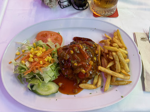 Wonderful place for those who want to enjoy good food and drink in peaceful surroundings. No traffic, no cars, just a promenade along the bar o restaurant. Good choice of music channel. The food absolutely wonderful good o not too expensive. Friendly staff. Nice personal.