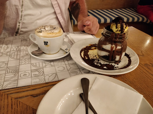 Starters: falafel and pulled pork roll Mains: steak with chimichurri and potato crisps and ribs with potato crisps Desserts: pan cookie with ice cream and 22° cup; a mix of cream, ice cream, meringue and brownie with choice of chocolate or toffee sauce. Drinks: 2 glasses of wine, 2 cokes, 2 coffees Extras: bread with tomato spread