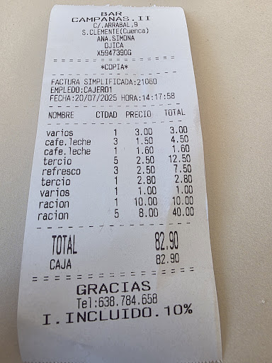 Read moreSomos de Valencia hemos ido los tres hermanos a pasar un día a nuestro pueblo San Clemente cuando era la hora de comer algo . Hemos entrado a picar algo a este bar , no teníamos muchas expectativas pero cual ha sido nuestra sorpresa al pedir los aperitivos todo estaba espectacular 👌 las raciones muy completas , hemos pedido medias raciones por recomendación del dueño, lo recomiendo de 10 un...