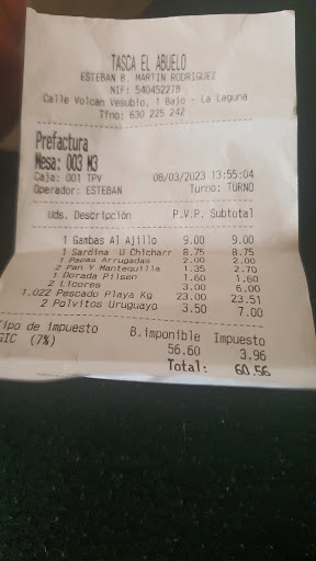 Read moreAntes con Jorge maravilloso, pero ya no es lo mismo. Tengo que destacar que el dueño es súper amable, pero lo demás fatal. Hoy fuimos mi esposo y yo a comer y nos quedamos con mucho mal humor, nos estafaron.. Pedimos una ración de sardinas y la sirvieron con papel de cartuchos de churros, las sardinas negras y arencadas , pedimos una de gambas, y eran gambas de las que usamos para pescar, 13 gambas en un montón de aceite... mi esposo pidió un pescado a la espalda y la cocinera, que parece que es anormal le trajo medio pescado, en mi vida había visto algo parecido, pedimos 2 vodka pomelos, los pusieron en vasos cortos y una cantidad que brillaba por su ausencia, lo único bueno fué las 4 papas arrugadas y el mini pan caliente ... y dos polvitos uruguayo, total salimos con hambre y salió 60.56 eur, una estafa de las grandes 😡😡😡 sardinas incomibles, medio pescado, y 13 gambas enanas, nunca más volveremos ➡️ 👉 JAMÁS ❌️ ➡️ Las sardinas dicen que eran frescas y eso es mentira, se de pescado y yo juraría que eran del 5 océanos de esas congeladas, o ya pasadas, horrible, se quedaron todas en el plato, menos 2 que fue la que probamos, lo del pescado fué increíble, mi esposo pidió un pescado a la espalda y le pusieron medio pescado a precio de oro, la verdad yo había otras veces y la comida estaba buena y normal de precios, pero hoy fue una gran estafa, gracias a mi esposo no me fui sin pagar o llamar a la policía por estafadores una vergüenza, un guachinche a precio de oro ... ya al menos podrían de dejar de cobrar las sardinas, que se quedaron en el plato, por algo sería, ni fotos saque del malhumor tan grande que cogí, estafadores sin ninguna...