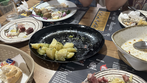 En fecha 15/02/25 he vuelto a este lugar. Habiendo reservado mesa con 15 días de antelación, llegamos a la hora que nos indicaron y resulta ser que mi reserva ni siquiera la llegaron a apuntar. Suerte que tenían una mesa libre. Lo malo? Las mesas cerca de la puerta reciben mucha corriente de aire cuando esta se abre. El ruido, lo mismo, que ya se ha indicado en otras reseñas. Pedimos media de carne de fiesta, media de pollo al ajillo, y la de queso asado con mojos. Nuevamente, como comenté en la anterior reseña, se echa en falta que la carne fiesta y el pollo tengan algo más de salsa o algo que no les haga estar tan secos. Y la cantidad de papas fritas que ponen es exagerada, hay un total desbalance en el plato, muy poca carne o pollo, y un montón de papas fritas, que estaban buenísimas pero lo veo desequilibrado.