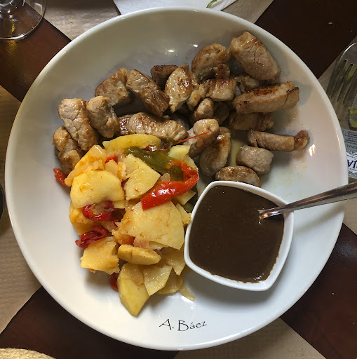 Pedimos: ensalada de pollo crujiente croquetas de atún lagarto ibérico con patatas fritas y manzana salteadas con romero polvito uruguayo