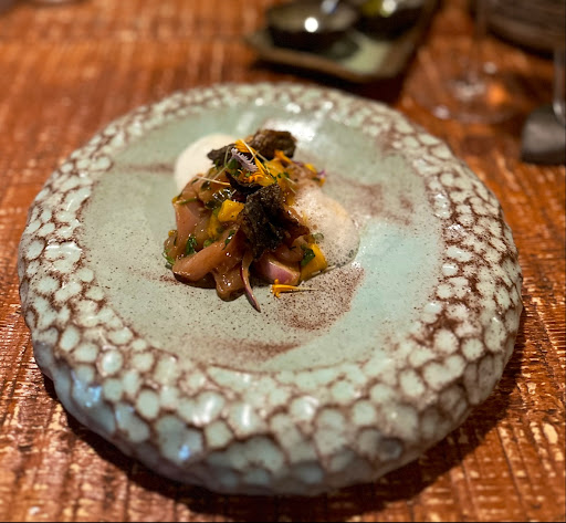 Tiradito de medregal con salsa de coco y jengibre Este plato representó un ejemplo brillante de la creatividad del chef. El medregal, un pescado típico de las costas canarias, fue tratado con una delicadeza impecable, destacando su textura y sabor natural. La salsa de coco y jengibre añadió una profundidad aromática que realzó el plato, fusionando influencias locales con un toque exótico que demuestra el dominio técnico y conceptual del chef.