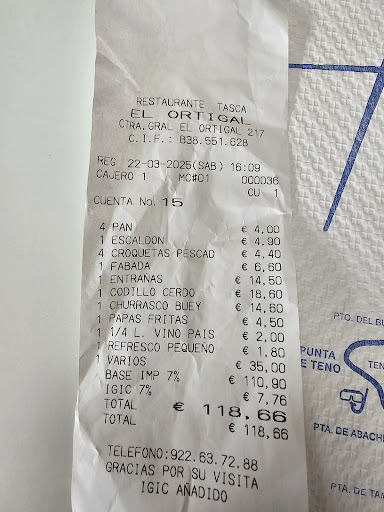 Me gusta ir a Guachinches, con el trato típico de lo que vamos a encontrar y los precios y calidad de la comida, local (si sales ahumado es un guachinche) aunque tradicional de calidad, a un precio concorde con el conjunto y raciones. Para sorpresa de todos vean el ticket de 4 personas. Precio de Restaurante Gourmet y calidad que cualquier guachinche supera en sabor textura , ingredientes, calidad de la cocina. Sin más que decir. Parece que la restauración a veces va para atrás en todo menos en sus precios. Una tristeza de ver como algunos locales poco a poco echan a los clientes a no volver con el respeto que cada uno lleve su negocio cómo considere mejor, yo como cliente...también. Había ido en varias ocasiones con anterioridad y siempre normal....