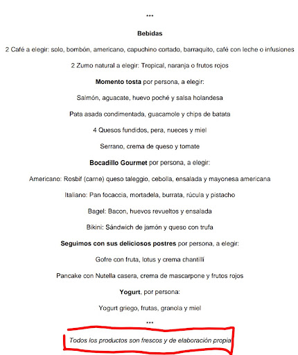 Read moreMI pareja vio el anuncio del local en BonosVip, y entonces me pasó el menú. En él ponía café, cortado, café con leche o barraquito por persona, y zumo de naranja, de frutas y otra cosa a elegir también por persona. Y luego se pasaba a la comida, donde ponía una tosta a elegir cada uno de entre varias opciones que ponían, y un bocadillo a elegir cada uno entre otras tantas opciones. Ponía a elegir para cada uno, tanto una tosta como un bocadillo, no una cosa u otra. Y ya luego yogur y postre, pero yo en lo que me centro es en lo de la tosta y el bocadillo, ya que en el momento de pedir, el camarero nos dice que hay un error en BonosVip, y que es una cosa u otra, no una de cada. Y para excusar, dice que entonces sería demasiada comida. A ver, yo para elegir ir ahí, he visto el menú, he visto la cantidad, y no me ha parecido excesivo, por eso decido pagarlo , y pago por lo que pone en BonosVip. Además, lo publican como un brunch valorado en 45 euros para 2 personas que se queda en 28 con ese descuento. Pero el que nos sirven es el que tienen allí en la carta, que son 16 euros por persona, es decir, de 32 a 28. Yo lo siento, no me gusta escribir reseñas negativas, pero es que lo ocurrido hoy hizo que hasta me sentara mal la comida, ya que me la comí con disgusto. Y viendo la cara que se le quedaba a la gente en las mesas de al lado cuando el camarero le decía lo mismo, me sorprende que no haya más de este tipo, pues me parece una estafa en toda regla, o al menos una publicidad engañosa, ya que también lo tienen puesto de la misma manera en su página de Facebook. Entiendo que con tosta y bocadillo si pudiese acercarse a ese valor de 45 euros, pero quitando una no. Muy disgustado, la verdad, y lo pongo por aquí porque no quería estar liándola en el local, pero me ha decepcionado muchísimo. Conmigo que no cuentes más que...