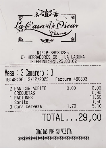 PRIMERA Y ÚLTIMA VEZ QUE VISITAMOS ESTE ESTABLECIMIENTO Esta tasca o taberna se encuentra ubicada en la calle Herradores de San Cristóbal de La Laguna (Tenerife), y entramos porque nos pareció que tenía muy buena presencia. Nos sentamos en una de las mesas del local y pedimos unas cañas de cerveza, unas croquetas de pollo (porque papas rellenas de carne no tenían, aunque este plato constaba en la carta) y una tortilla española de gambas y champiñones, así como, pan con aceite. El caso es que nos sirvieron las croquetas a los diez minutos, aproximadamente, de habernos sentado, y la tortilla a la media hora, cuando vimos, luego, que comensales que llegaron mucho más tarde que nosotros les servían las tortillas entre los diez y quince minutos de su llegada. El caso es que en la mesa, una vez que nos sirvieron las cañas, nos colocaron una especie de cubilete negro rectangular (más parecido a un cubo) y ahí quedó, pues, ¡ni idea de para qué cosa era aquello! Comimos las croquetas, que no estaban nada mal, la verdad, y después, al cabo del rato y de haber hecho la digestión de las mismas, nos trajeron la tortilla que, dicho sin ánimo de ofender, las de Mercadona, que no llegan a los tres euros la unidad, le dan más de cien vueltas a esta que consumimos, pues, el sabor era pésimo y, para colmo, «enyugaba» (engasgaba). Cuando tocó pagar, en la factura nos habían puesto el «pan con aceite» y reclamamos que no nos lo habían servido, así que, como se puede ver en la factura, lo descontaron de la misma y la abonamos (29 euros), empero, en esto que uno de los camareros trajo el cubilete negro con el pan dentro, en el fondo, que no se veía cuando lo pusieron en la mesa porque, sencillamente, es un cubilete muy hondo, con un pan minúsculo (más pequeño que el de una «pulguita» y por el que cobran 1 euro) y que no se veía (dicho sea de paso, esta no es manera de colocar panes en la mesa de los comensales, lo suyo debería ser una canastilla) y demasiado alto. Les dije que no había visto el pan y que, no obstante, podían cobrármelo (se los repetí dos veces), a lo que respondieron que no, que no tenía mayor importancia... y todo hubiera quedado de este tamaño. Sin embargo, saliendo ya por la puerta de la taberna, un «tabernícola», que no tabernero (que es un personaje absolutamente respetable y al que este individuo impresentable no le llegaría ni a las suelas de los zapatos), demostrando su falta de respeto y educación, su grotesca chulería y ser un borde prepotente, nos gritó «que la próxima vez nos pusiéramos unas gafas». Es obvio que esto sobraba y no hacía ninguna falta soltar semejante burrada a un cliente (aunque tal vez estuviera refiriéndose a unas gafas de buceo para encontrar el pan en el fondo del cubilete), pues, era un añadido innecesario ya que pudo haber cobrado el pan cuando se lo ofrecí, pero, le pudo más la grosería y la chulería del típico bravucón barriobajero. Otras personas podrán tener distintas experiencias en este lugar, pero, les recomiendo que pongan cuidado con estos sujetos de «La Casa de Óscar» y con lo que les emplaten y lleven a la mesa. Pues, eso, que les vaya bonito y procuren llevar gafas...