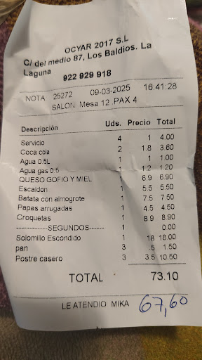 Read moreFuimos muy ilusionados. Cada vez que venimos a Tenerife nos gusta probar un Guachinche nuevo. Ésta vez hemos salido algo decepcionados. Una de las razones por las que fuimos era para probar el escaldon y el solomillo escondido. La croquetas de pollo estaban bastante buenas, el queso con gofio y miel de palma insípidos, las papas una ración, poca cantidad. La batata con almogrote bastante buena. El servicio va como loco, tienes que estar detrás de ellos bastante tiempo y algunos con malas caras o directamente ignorandonos. Les aseguro que hemos tenido la suficiente paciencia para entender que a veces van a las carreras. Hemos visto que no llegaba el escaldon y hemos avisado DOS VECES, no nos han hecho mucho caso ninguno de los dos camareros. Hemos visto como salían y los servían a mesas después que nosotros. Nos hemos resignado ya bastante indignados por el poco cuidado hacia el cliente. Hemos vuelto a avisar a la camarera que fue la que pidió la comanda y se lo hemos dicho que no había llegado y que ya habíamos terminado el primer plato, que lo quitara de la comanda. Hemos pedido postre. Al llegar a pagar ha quitado el escaldon que nunca llegó y le he dicho que no habíamos pedido agua con gas y ella con un rintintin delante de cliente me ha contestado bueno son solo 20 céntimos... Y por educación no le he contestado que como si son 5, YO DECIDO SI SE LO QUEDAN ELLOS O YO. Anotar que hemos visto en la cuenta un cobro que pone SERVICIO 4 EUROS (éramos 4 personas) es la primera vez que veo algo así. No se han dignado ni pedir disculpas y lo mejor de todo es que la chica no se ha molestado ni en despedirse al pagar la cuenta. Directamente se ha girado y nos hemos quedado esperando... Repetir no será...