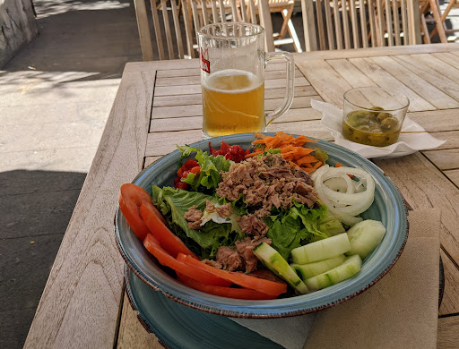 We decided to leave the tourist spots in the South of the island and took a bus then a tram to get to this place in the historic area of the North, and we were glad we did. Looking around for somewhere to eat on a lovely day, we found this place. Right in one of the best tourist spots, in the sun, we had a leisurely lunch which was very good. A jarra of local beer, a generous Mediterranean salad and a side portion of olives certainly hit the spot. Service was relaxed, the salad took some time to come, but we were on holiday so had plenty of time. Staff were patient, cheerful and helpful. The salad was freshly made and supplied with olive oil and balsamic vinegar to taste. It was followed by a decent coffee, a Cappuccino for me and an Americano for my wife. Pricing was reasonable under 9 euros for the salad, and 3 euros for my Cappuccino. A generous helping of olives were a bargain at 1 euro. The menu was available in English from a QR code on the table and we managed to get a table in the shade from an umbrella to watch the world go by.....