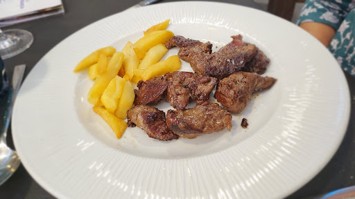 Varias opciones para comer. Menú del día a 13€, y dos menús degustación uno a 25€ y otro a 27€. Como estos dos incluían de gundo plato opciones lejanas (gambas, zamburiñas, pulpo y chipirones), hemos optado por el menú del día que nos cantó el camarero. Y no nos hemos equivocado. Patatas revueltas ligeras, nada grasientas y en su punto de pimentón y picante. Un pastel de espinacas sin interés. Y dos segundos magníficos. Un cochifrito seco, tierno crujiente y sabroso. Y los mejor de todo: unas carrilleras a la plancha ¿brasa? Melosas, sabrosas, tiernas, excelentes. Tanto que tuvimos que preguntar si estaban precocidas de lo jugosas que las encontramos ¿La respuesta? Acércate y te informas. La guarnición unas patatas fritas caseras pero mejorables. Postres caseros para un buen final.